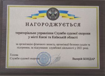 Також полковник Служби судової охорони зазначив, що робота Територіального управління Служби судової охорони у місті Києві та Київській області відмічена Головою Служби судової охорони Валерієм Бондарем і колектив нагороджено грамотою – за організацію фізичного захисту, організацію безпеки суддів та підтримки за підсумками за підсумками службової діяльності у 2021 році.