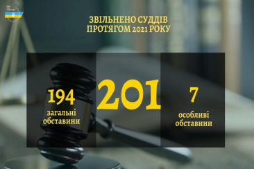 Протягом 2021 року Вища рада правосуддя ухвалила рішення щодо звільнення 194 суддів з посад за загальними обставинами: 190 – у зв’язку з поданням заяв про відставку, 4 – у зв’язку з поданням заяв про звільнення за власним бажанням.