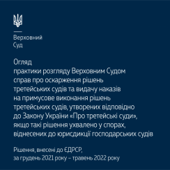 Пропонуємо до вашої уваги огляд практики розгляду Верховним Судом справ про оскарження рішень третейських судів та видачу наказів на примусове виконання рішень третейських судів, утворених відповідно до Закону України «Про третейські суди», якщо такі рішення ухвалено у спорах, віднесених до юрисдикції господарських судів, за період із грудня 2021 року по травень 2022 року.