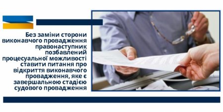 Без заміни сторони виконавчого провадження правонаступник позбавлений процесуальної можливості ставити питання про відкриття виконавчого провадження, яке є завершальною стадією судового провадження, та вчиняти інші дії згідно із Законом України «Про виконавче провадження».