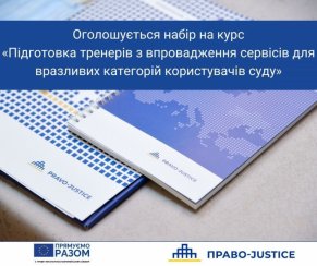 В рамках реалізації ініціативи "Модельні суди" Проєктом ЄС "ПРАВО – JUSTICE" планується проведення четвертого набору навчального курсу "Підготовка тренерів з впровадження сервісів для вразливих категорій користувачів суду".