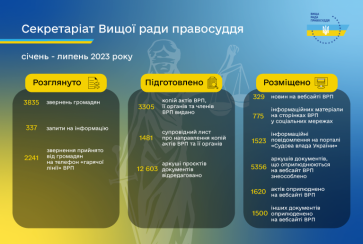 Протягом січня - липня 2023 року секретаріатом ВРП підготовлено 1481 супровідний лист про надсилання копій актів ВРП та її органів, видано 3305 копій актів ВРП, її органів та членів ВРП, відредаговано 12 603 аркуші проєктів документів ВРП.