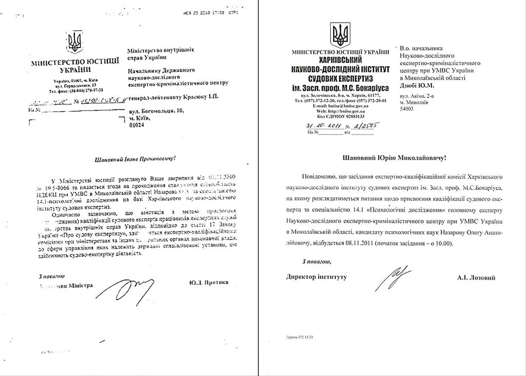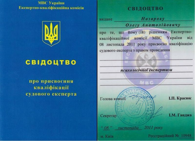 Історично, ще під час проходження служби в МВС, а саме в листопаді 2011 року, також ВПЕРШЕ, але в Міністерстві внутрішніх справ, Назаровим О.А. було складено комплексний іспит на присвоєння кваліфікації судового експерта з правом проведення психологічних експертиз в де-факто спільно створеній за погодженням між міністерствами, міжвідомчій Експертно-кваліфікаційній комісії Міністерства внутрішніх справ України і Міністерства юстиції України на базі Харківського науково-дослідного інституту судових експертиз імені Засл. проф. М.С. Бокаріуса.