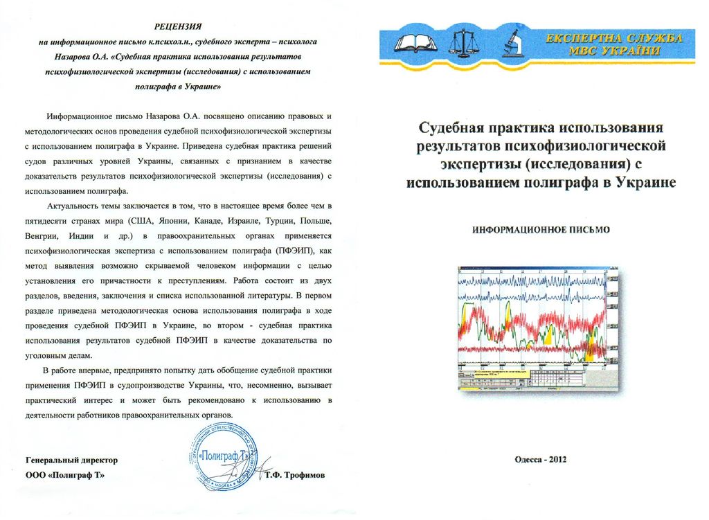 В 2012 році видано інформаційного листа: Назаров О.А. Судебная практика использования результатов психофизиологической экспертизы (исследования) с использованием полиграфа в Украине. Інформаційний лист. - Одесса: НИЭКЦ при ГУМВД Украины в Одесской области, 2012. - 31 с. на якій отримано позитивну рецензію викладача - наставника і видатного поліграфолога, інженера розробника поліграфів Трофимова Тимофія Федоровича з метою започаткування на рівні державних науково-дослідних установ України проведення судової психологічної експертизи із застосуванням поліграфа.