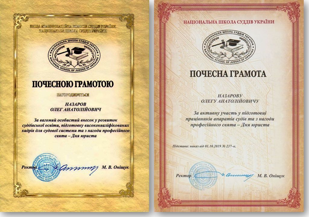 Дієва та ефективна просвітницька робота з суддями, прокурорами, співробітниками органів внутрішніх справ сприяла неодноразовому нагородженню судового експерта Назарова Олега Анатолійовича почесними грамотами Національної школи суддів України та іншими відомчими знаками заохочення МВС.