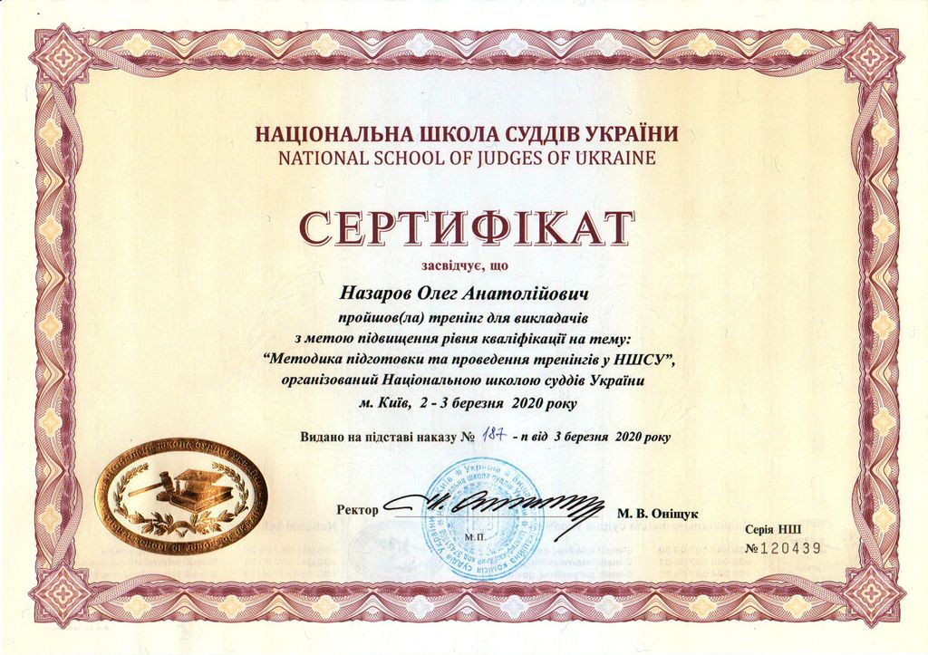 В березні 2020 року Назаров О.А. став акредитованим тренером Національної школи суддів України з проведення тренінгів по напрямках судової експертизи і досліджень на поліграфі.