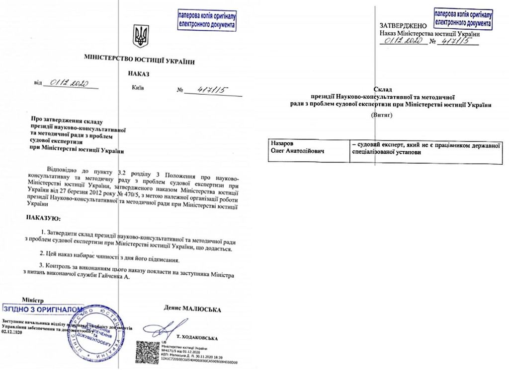 В серпні 2020 року рішенням директорки Департаменту експертного забезпечення правосуддя Міністерства юстиції України Ткаченко Н.О. судового експерта психолога Назарова Олега Анатолійовича було зараховано до складу секції судово-психологічної експертизи Науково-консультативної та методичної ради при Міністерстві юстиції України, а 01 грудня 2020 року наказом Міністра юстиції України № 4171/5 Назаров Олег був зарахований до складу керівного органу (Президії) Науково-консультативної та методичної ради при Міністерстві юстиції України як представник громадської організації судових експертів «Всеукраїнська незалежна науково-дослідна експертна спілка».