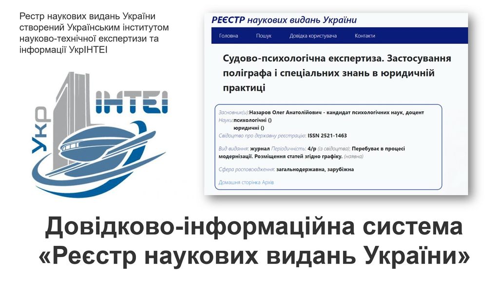 14 вересня 2021 року Державна наукова установа «Український інститут науково-технічної експертизи та інформації» (скор. - УкрІНТЕІ) включила реферативно-науковий online журнал «Судово-психологічна експертиза. Застосування поліграфа і спеціальних знань в юридичній практиці» в Реєстр наукових видань України. «Реє́cтр науко́вих вида́нь Украї́ни» - довідково-інформаційний ресурс, призначений для інформування наукової громадськості та покращення доступу до відомостей про українські наукові видання з різних галузей знань. Офіційна сторінка журналу в «Реєстрі наукових видань України» знаходиться за посиланням - http://nfv.ukrintei.ua/view/614090f159cc1d06af650872