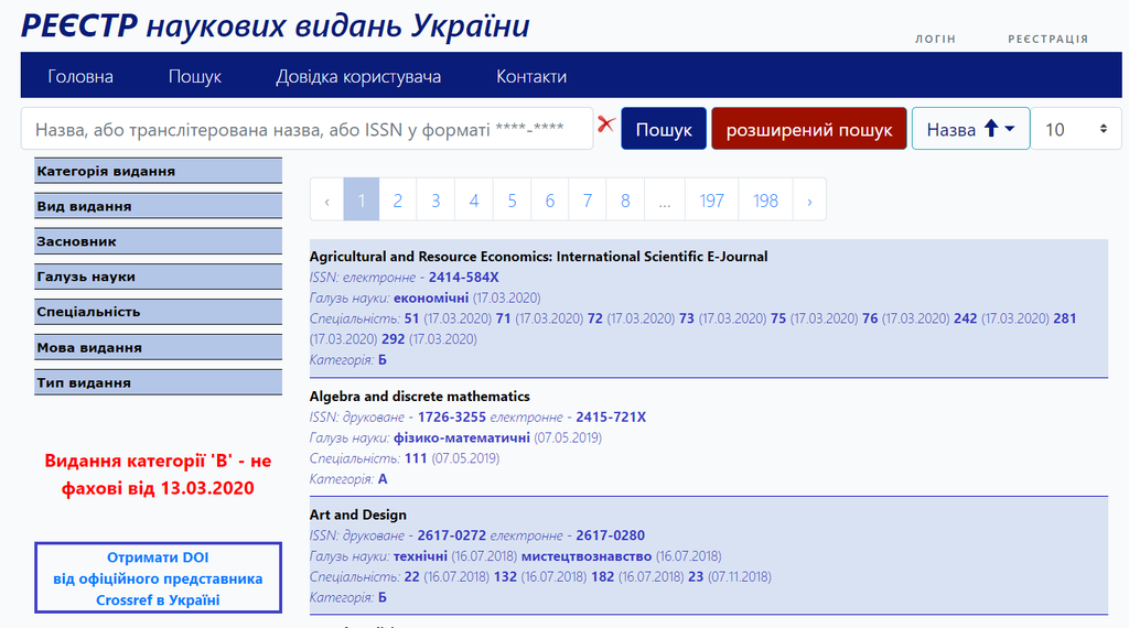 «Реє́cтр науко́вих вида́нь Украї́ни» створений фахівцями державної наукової установи «Український інститут науково-технічної експертизи та інформації». Відомості про наукові фахові видання, представлені на ресурсі, регулярно оновлюються, а загальний перелік актуалізується відповідно до рішень, прийнятих МОН України згідно з наказом від 15.01.2018 р. №32. Ресурс розрахований на науковців, освітян, інноваторів, наукові установи та організації України, заклади вищої освіти, юридичних та фізичних осіб, що створюють або мають на меті використання науково-технічного потенціалу України.
