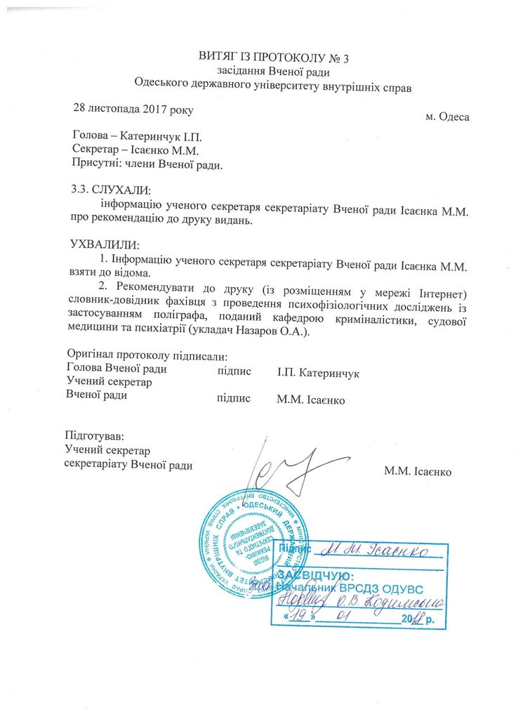 Витяг з протоколу № 3 від 27.11.2017 року засідання Вченої ради Одеського державного університету внутрішніх справ