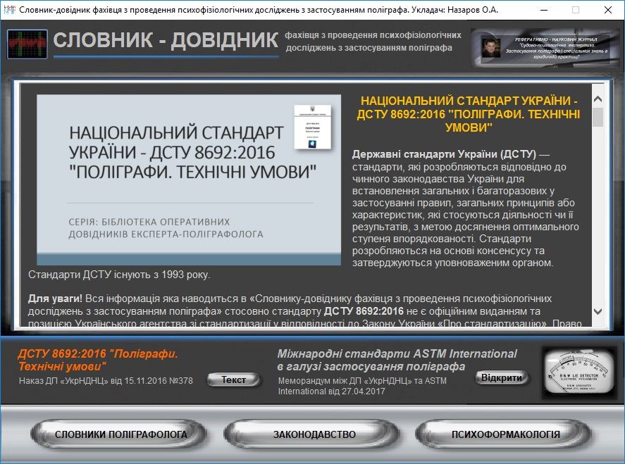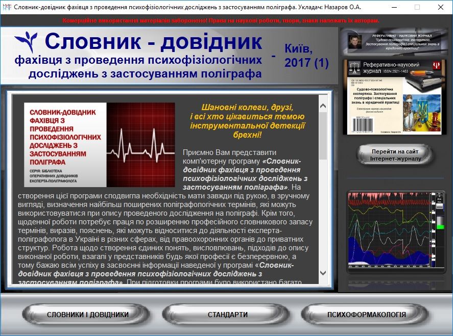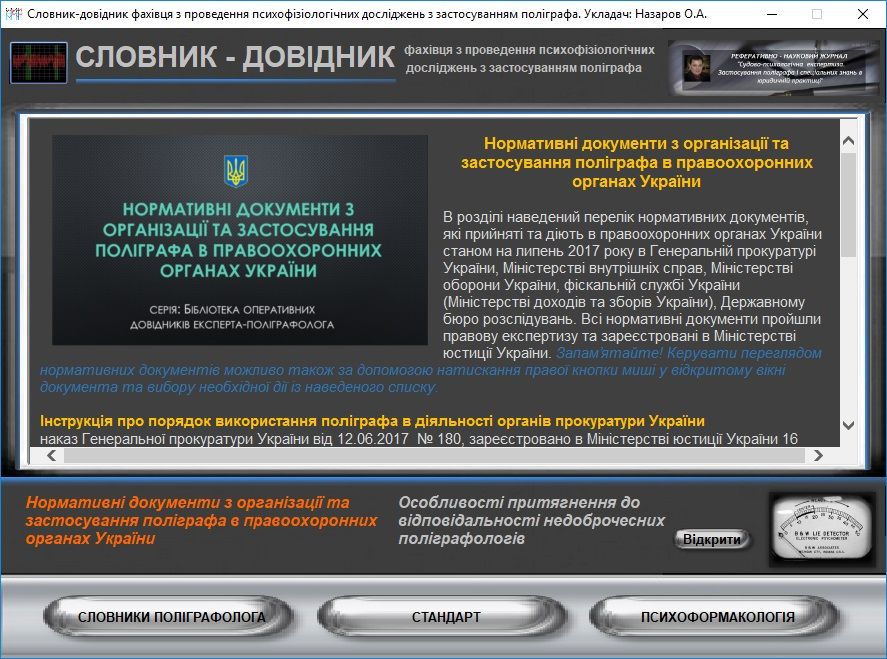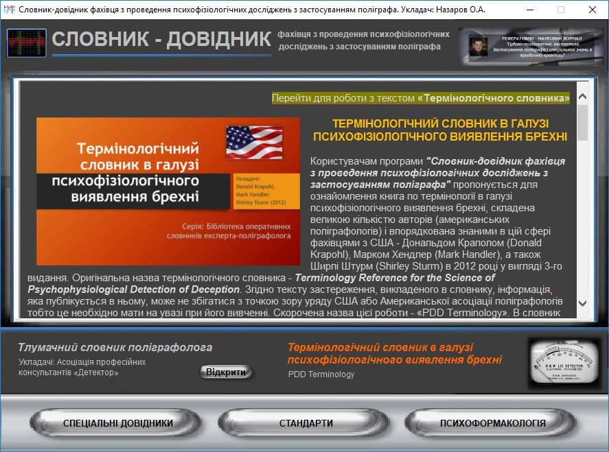 Шановні колеги, друзі, і всі хто цікавиться темою інструментальної детекції брехні! Приємно Вам представити комп'ютерну програму «Словник-довідник фахівця з проведення психофізіологічних досліджень з застосуванням поліграфа». На створення цієї програми сподвигла необхідність мати завжди під рукою, в зручному вигляді, визначення найбільш поширених поліграфологічних термінів, які можуть використовуватися при опису проведеного дослідження на поліграфі. Крім того, щоденної роботи потребує праця по розширенню професійного словникового запасу термінів, виразів, пояснень, які можуть відноситися до діяльності експерта-поліграфолога в Україні в різних сферах, від правоохоронних органів до приватних структур. Рішенням Вченої ради Одеського державного університету внутрішніх справ від 27.11.2017, протокол №3 «Словник-довідник фахівця з проведення психофізіологічних досліджень з застосуванням поліграфа» рекомендовано до друку та практичного використання в діяльності поліграфологів.