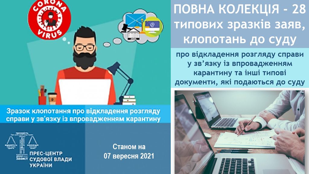 РОЗДІЛ 1. Колекція - 28 типових зразків заяв, клопотань про відкладення розгляду справи у зв’язку із впровадженням карантинних обмежень та інші стандартні заяви, клопотання, які подаються до суду станом на 07 вересня 2021