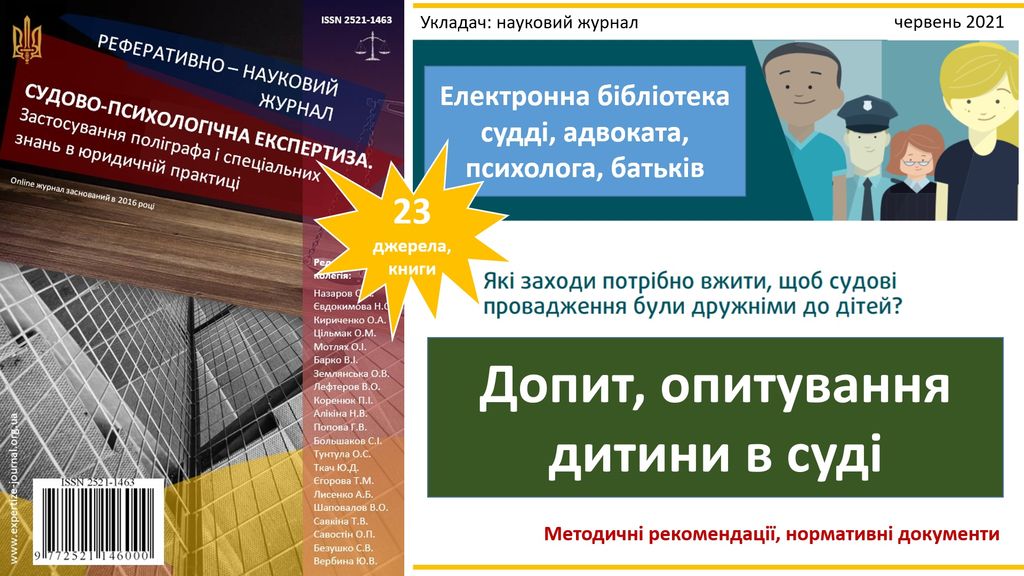 Науковий журнал «Судово-психологічна експертиза. Застосування поліграфа і спеціальних знань в юридичній практиці» став укладачем першої електронної бібліотеки судді, адвоката, психолога, батьків на тему: «Допит, опитування дитини в суді». Були зібрані існуючи методичні рекомендації, нормативні документи, постанови Верховного Суду, які стосуються з'ясування думки дитини в судовому процесі та психологічних особливостей її допиту з урахуванням емоційних, психологічних та поведінкових особливостей дитини. Станом на червень 2021 року електронна бібліотека нараховує більше 20 різних джерел, книг, контрольних питань та 6 постанов Верховного Суду. Упорядником бібліотеки є редакція наукового журналу «Судово-психологічна експертиза. Застосування подіграфа і спеціальних знань в юридичній практиці». Звертаємо увагу, що всі права на твори є власністю їх авторів та правовласників, на Інтернет-ресурсі вони представлені виключно з інформаційною та освітньою метою!