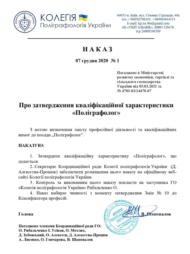 Відповідно до Порядку розроблення та затвердження кваліфікаційних характеристик, затвердженого наказом Мінсоцполітики від 31.05.2017 № 918, зареєстрованим у Міністерстві юстиції України від 23.06.2017 за № 784/30652, кваліфікаційна характеристика професії «Поліграфолог» погоджена з Мінекономіки України (аркуш погодження - лист Мінекономіки України від 05.03.2021 за № 4703-03/14470-07).