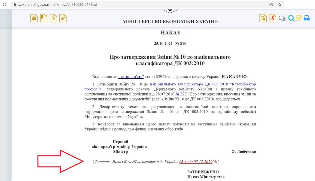 Також для зручності застосування, на офіційному сайті Верховної Ради України було розміщено наказ ГО «Колегія поліграфологів України» від 07.12.2020 № 1 «Про затвердження кваліфікаційної характеристики «Поліграфолог», разом з наказом Мінекономіки України від 25.10.2021 № 810-21 «Про затвердження Зміни №10 до Національного класифікатора ДК 003:2010», який ввів в дію кваліфікаційну характеристику професії «Поліграфолог» в Україні (не застосовується до діяльності державних установ, правоохоронних органів, місцевих органів влади) з 25.10.2021 року. - URL: https://zakon.rada.gov.ua/rada/show/v0810930-21#Text
