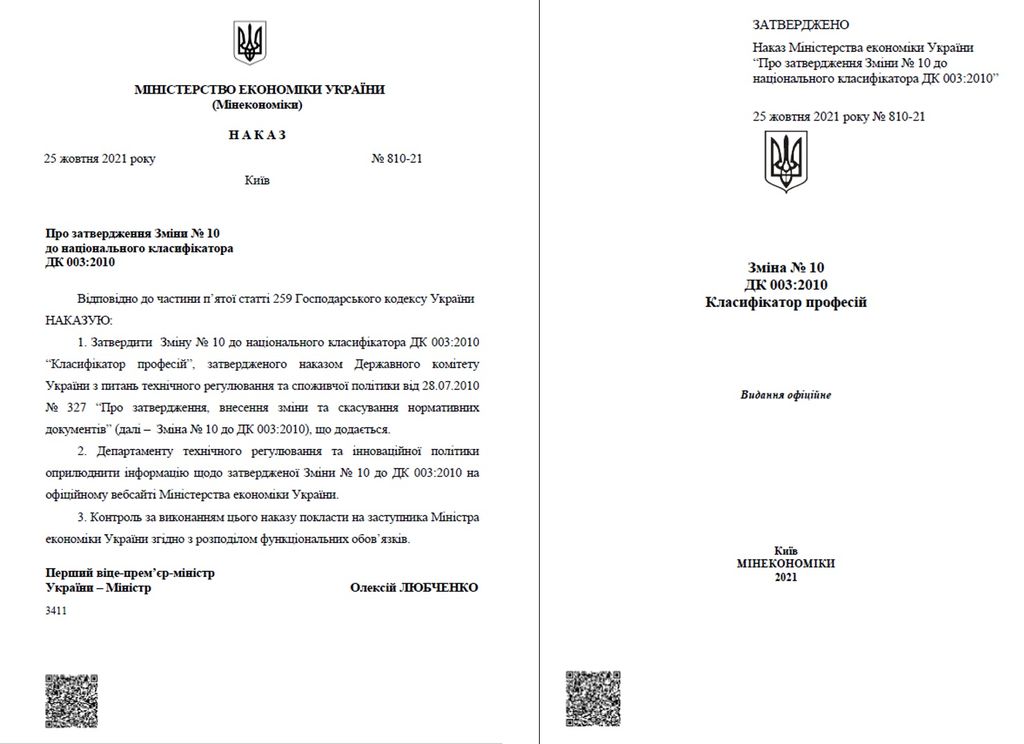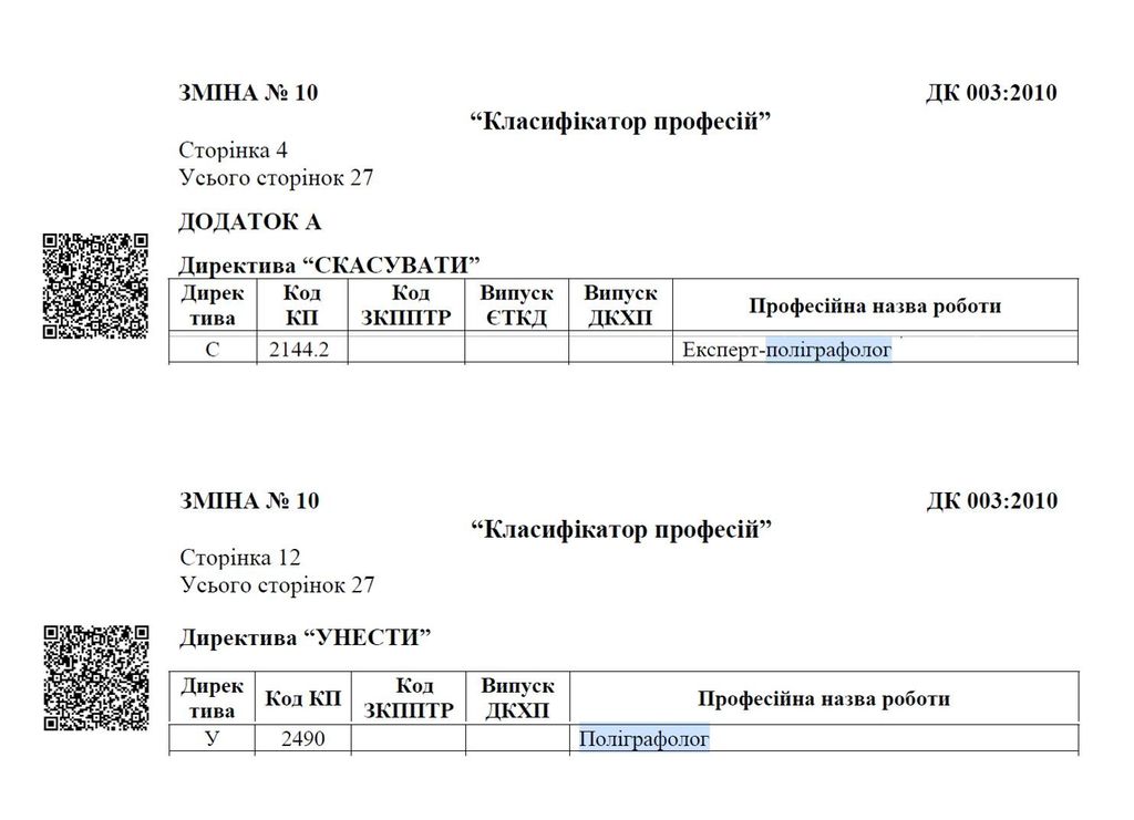 Бібліографічний опис: Зміни № 10 до національного класифікатора ДК 003:2010, які затверджені наказом Міністерства економіки України від 25.10.2021 № 810. Додаток А. - стор. 4, 12 за текстом: «Скасувати професію Експерт - поліграфолог, код КП 2144.2, директива С та унести професію Поліграфолог, код КП 2490, директива У». Кваліфікаційна характеристика професії поліграфолог затверджена наказом ГО «Колегія поліграфологів України» від 07.12.2020 № 1. - URL: https://zakon.rada.gov.ua/rada/show/v0810930-21#Text