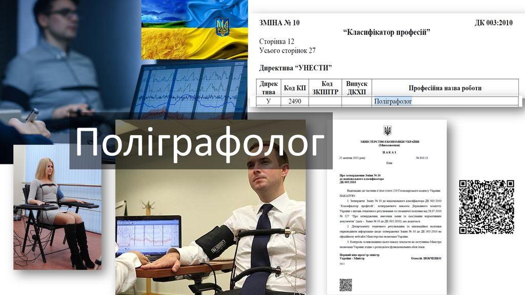 Міністерством економіки України 25 жовтня 2021 року було видано наказ № 810-21 «Про затвердження Зміни №10 до Національного класифікатора ДК 003:2010», яким внесено зміни до Національного класифікатора України ДК 003:2010 «Класифікатор професій», а саме: уведено нову професійну назву роботи (посади) «Поліграфолог» (код 2490, підклас 2490 «Поліграфолог», професійне угруповання «Професіонали, що не входять в інші класифікаційні групи» розділу 2 «Професіонали») та скасовано застарілу і невірну професійну назву роботи (посади) «Експерт-поліграфолог» (код 2144.2, підклас «Професіонали в галузі електроніки та телекомунікацій», професійне угруповання «Інженери в галузі електроніки та телекомунікацій» розділу 2 «Професіонали»).