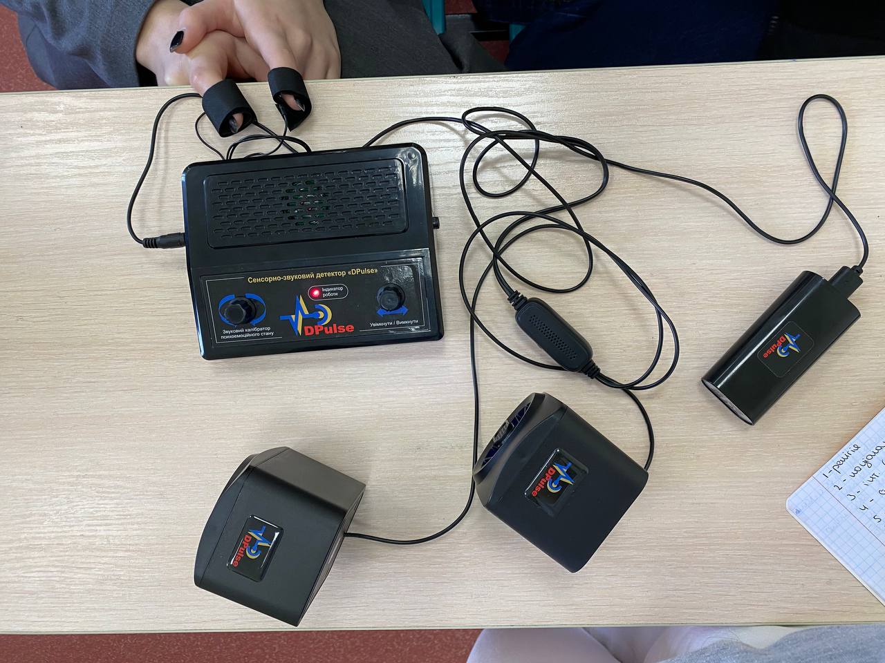 Загальний вигляд сенсорно-звукового детектора електродермальної активності «DPulse». Детектор зазвичай комплектується колонками для підсилення звуку та повербанком для забезпечення роботи колонок в будь яких умовах. Електроспоживання самого детектора здійснюється від 2 батареєк типу АА. Кріплення давачів здійснюється на вказівні пальці двох рук людини для точності подальшої діагностики.